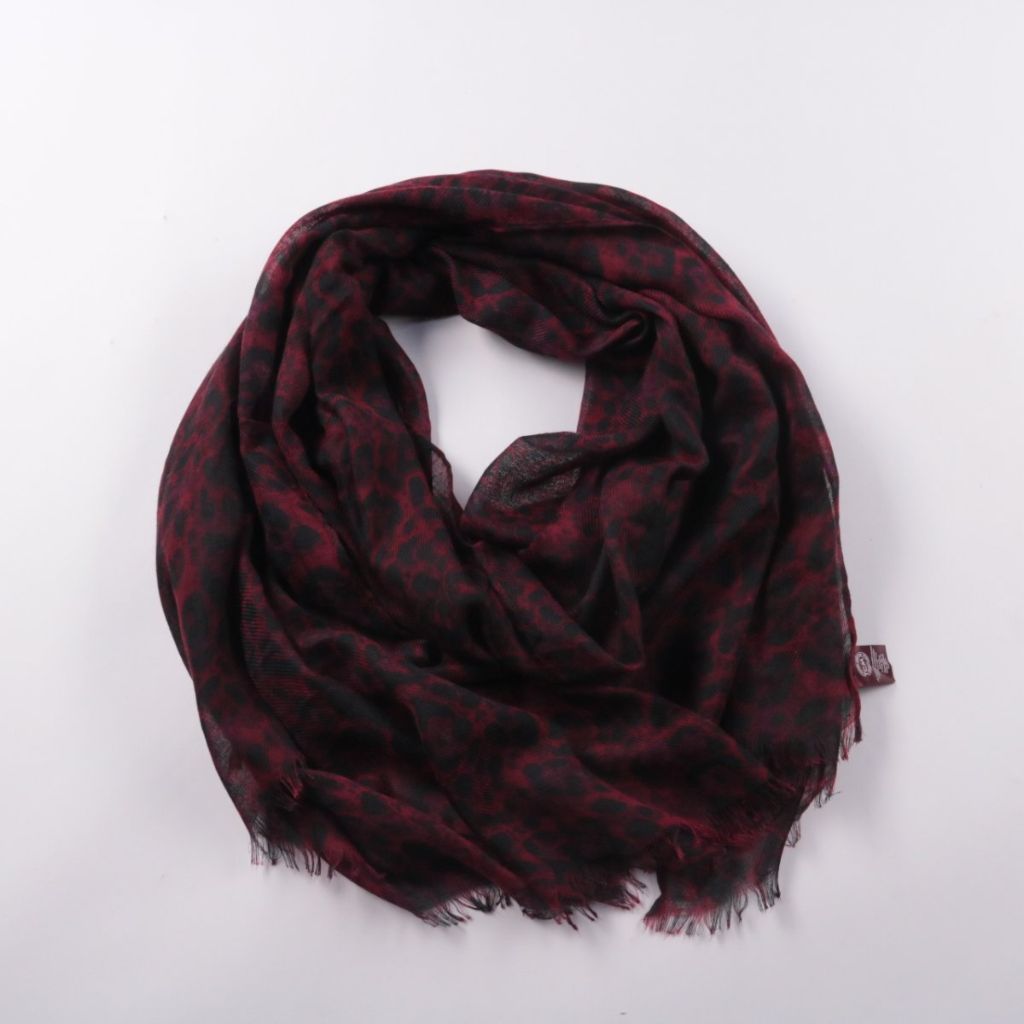Шарф TCM бордово-чёрного цвета с леопардовым принтом и лёгкой бахромой по краю. Подойдёт для повседневных образов в демисезон и зимой как дополнительный слой. Тонкий полиэстер почти не мнётся и быстро сохнет.