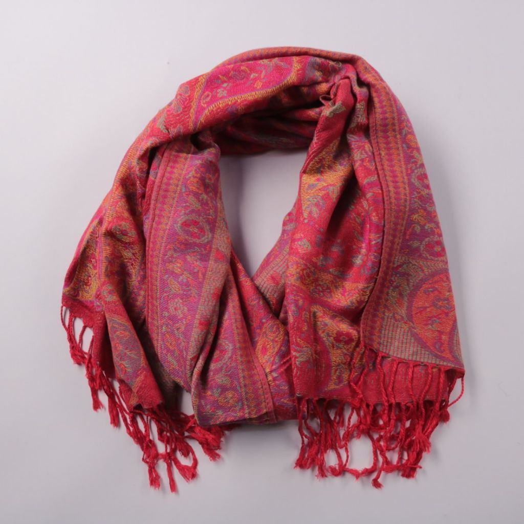 Тканый шарф с орнаментом пейсли и бахромой по краям, без указания бренда. Подойдёт для прохладной погоды и как акцент к повседневным образам. Можно носить свободно на шее или накинуть как лёгкий палантин.