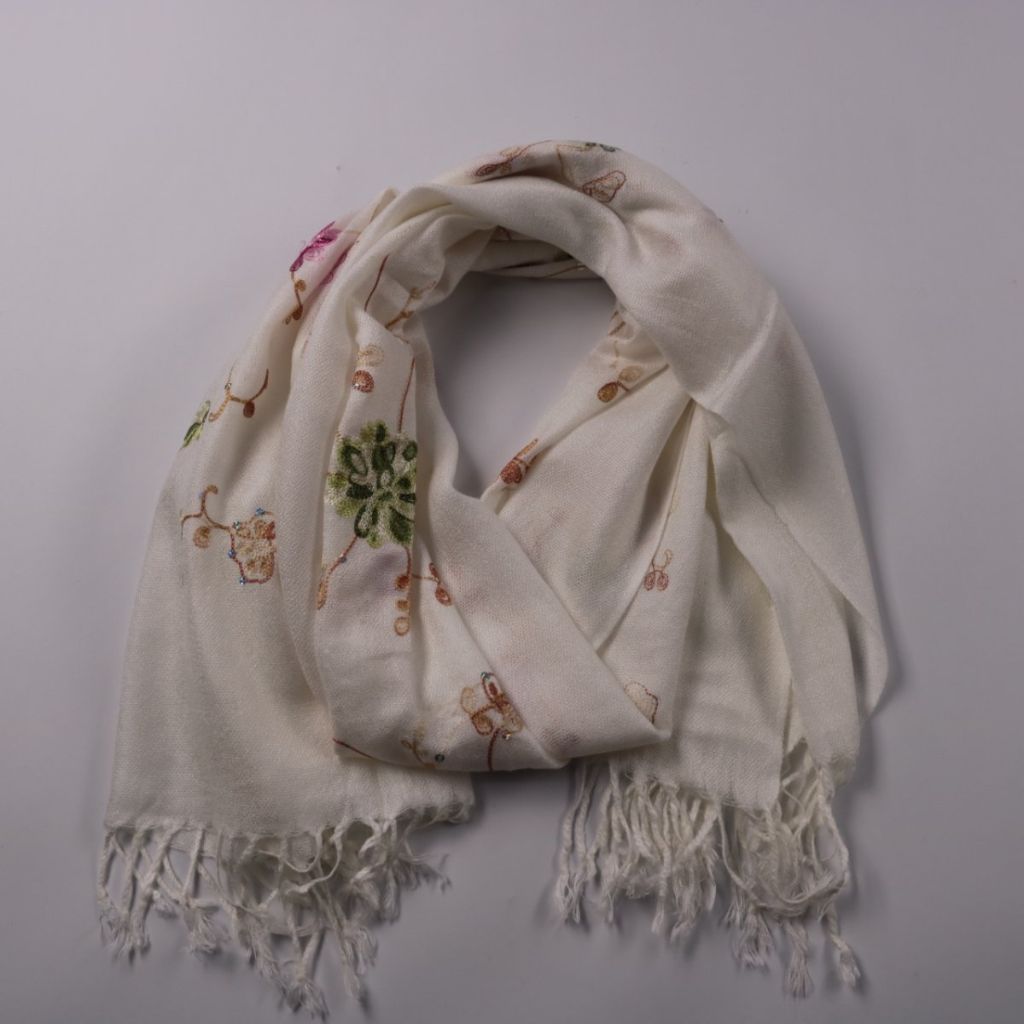 Шарф светло-молочного цвета с вышитым цветочным рисунком и кисточками по краям. Подойдёт для демисезонных образов и как лёгкий акцент к пальто или куртке. Мягкая ткань удобно драпируется и не занимает много места в сумке.