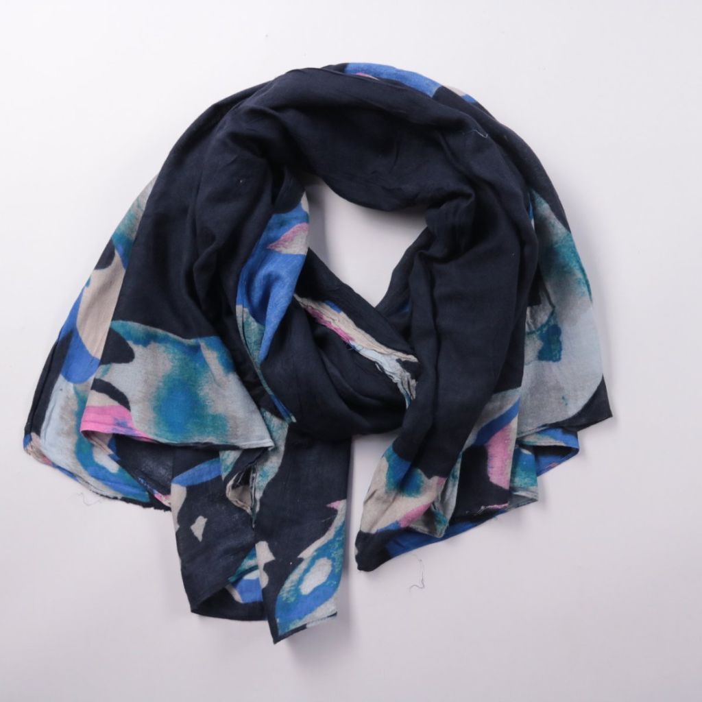 Лёгкий шарф с абстрактным принтом в сине‑розовых оттенках на тёмном фоне. Подойдёт для повседневных образов и в офис, чтобы добавить цветовой акцент. Тонкая ткань удобно драпируется и не занимает много места в сумке.