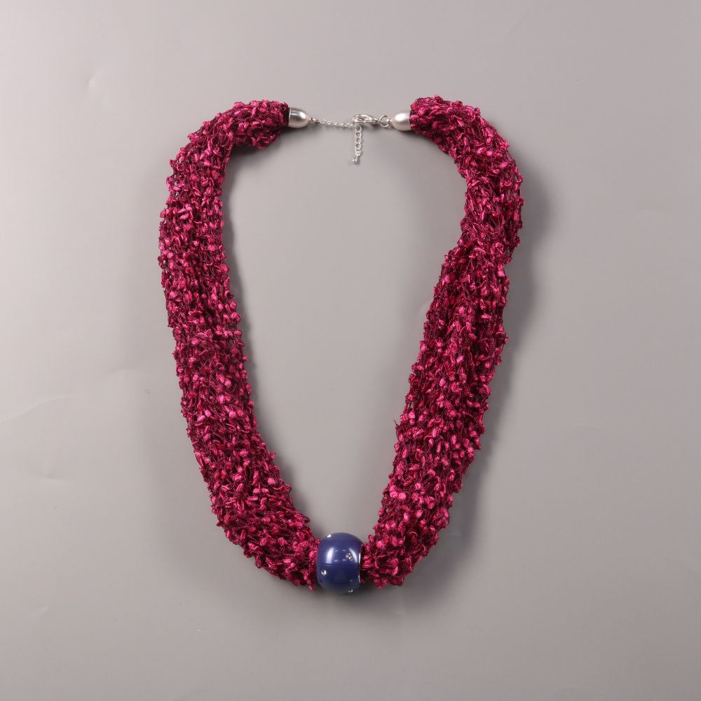 Женское ожерелье с фактурным плетением в бордовом цвете и крупной синей бусиной-акцентом. Подойдёт для вечерних образов и для того, чтобы оживить однотонный верх. Регулируемая цепочка позволяет подогнать длину под вырез.