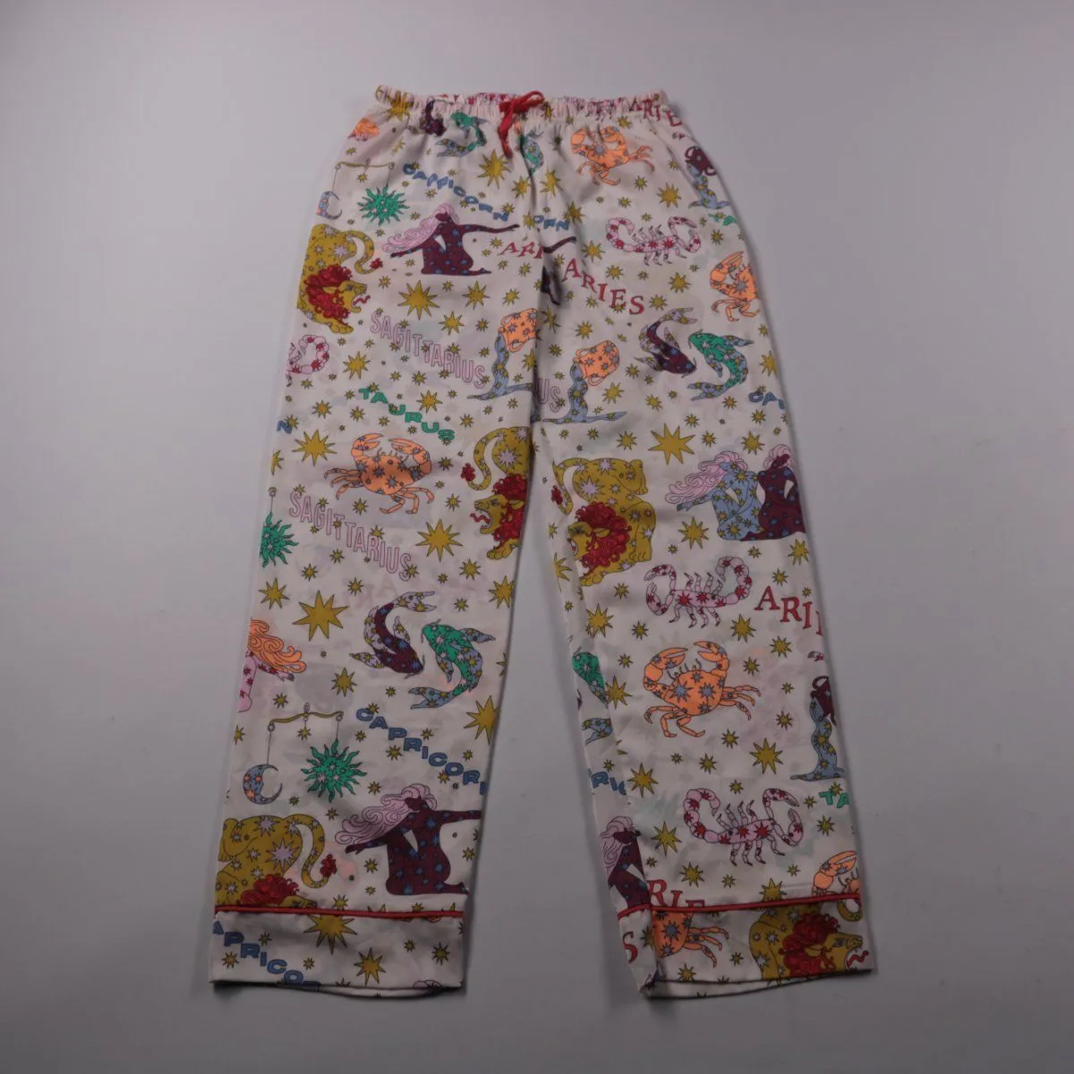 Пижамные брюки M&S белого цвета с ярким принтом со знаками зодиака и звёздами. Подойдут для сна и домашнего отдыха, пояс на резинке с завязкой. Лёгкая ткань и свободный крой не стесняют движений.