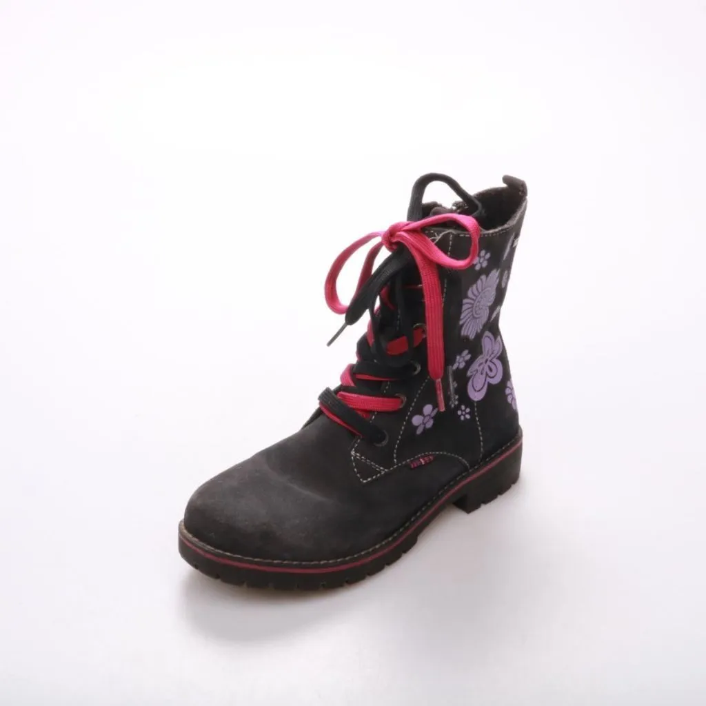 Детские ботинки со шнуровкой и боковой молнией, чёрные с розовыми шнурками и принтом с цветами/бабочками. Подойдут для прогулок в прохладную погоду и на каждый день. Молния сбоку помогает быстро надевать и снимать обувь.