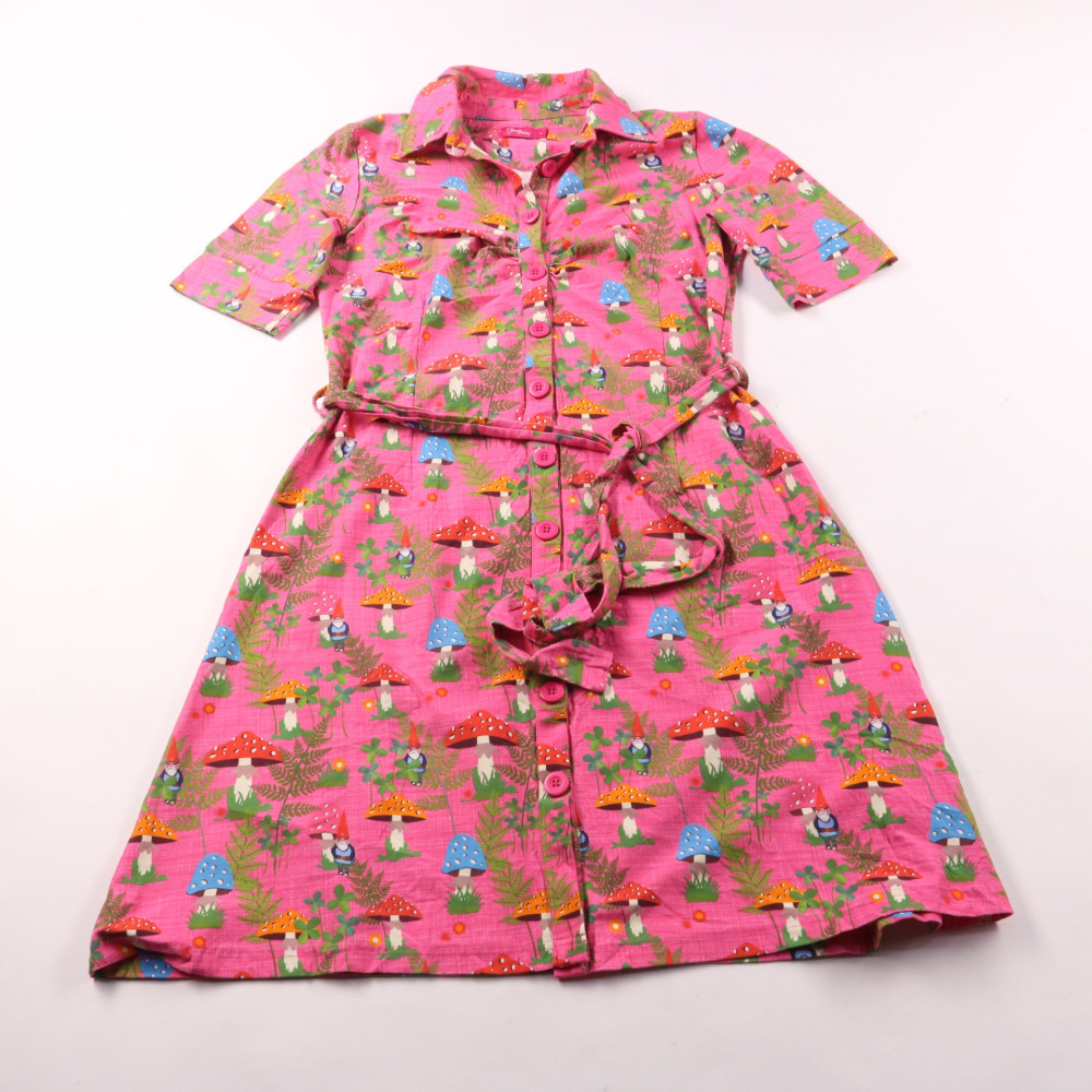 Платье-рубашка Tante Betsy ярко-розового цвета с принтом грибочков, на пуговицах и с поясом на талии. Подойдёт для прогулок и детского сада в тёплую погоду. Натуральный хлопок со эластаном хорошо дышит и немного тянется, поэтому удобно в носке.