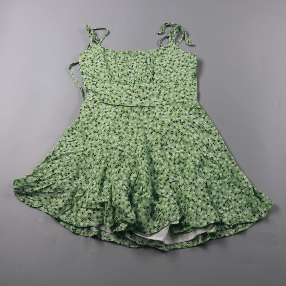 Летнее платье для девочки на тонких бретелях, светло‑зелёное с мелким цветочным принтом. Подойдёт для прогулок и отдыха в тёплую погоду, бретели завязываются и позволяют подогнать посадку. Лёгкая ткань и свободная юбка не сковывают движения.