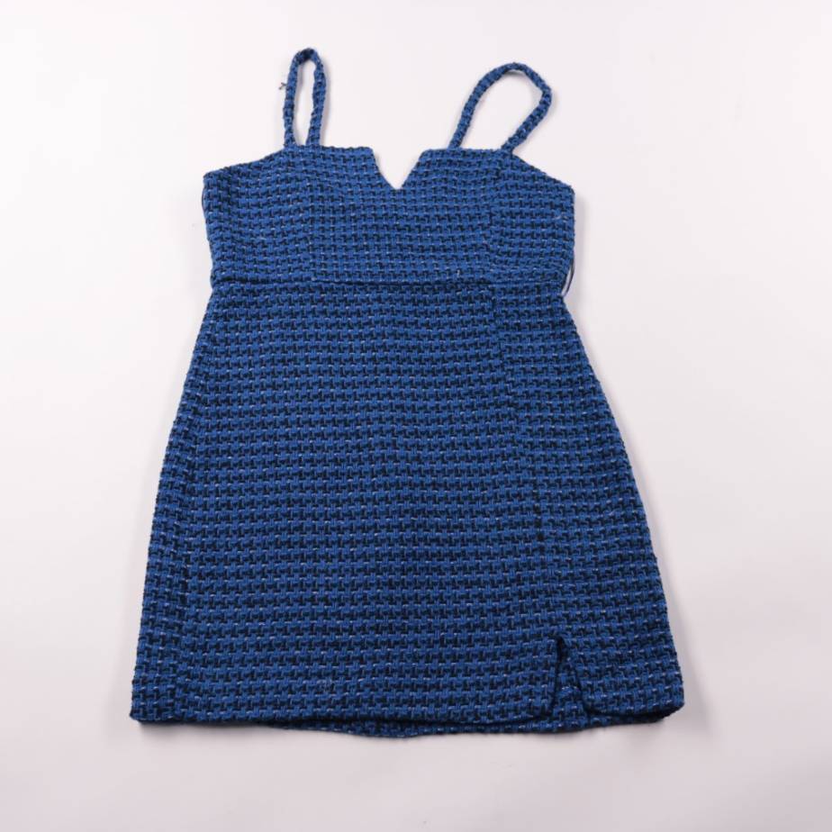 Платье Zara на тонких бретелях из плотной фактурной ткани синего цвета, с V-образным вырезом. Подойдёт для повседневных выходов и праздников, хорошо смотрится с водолазкой или блузкой под низ. Плотный материал держит форму и меньше мнётся.