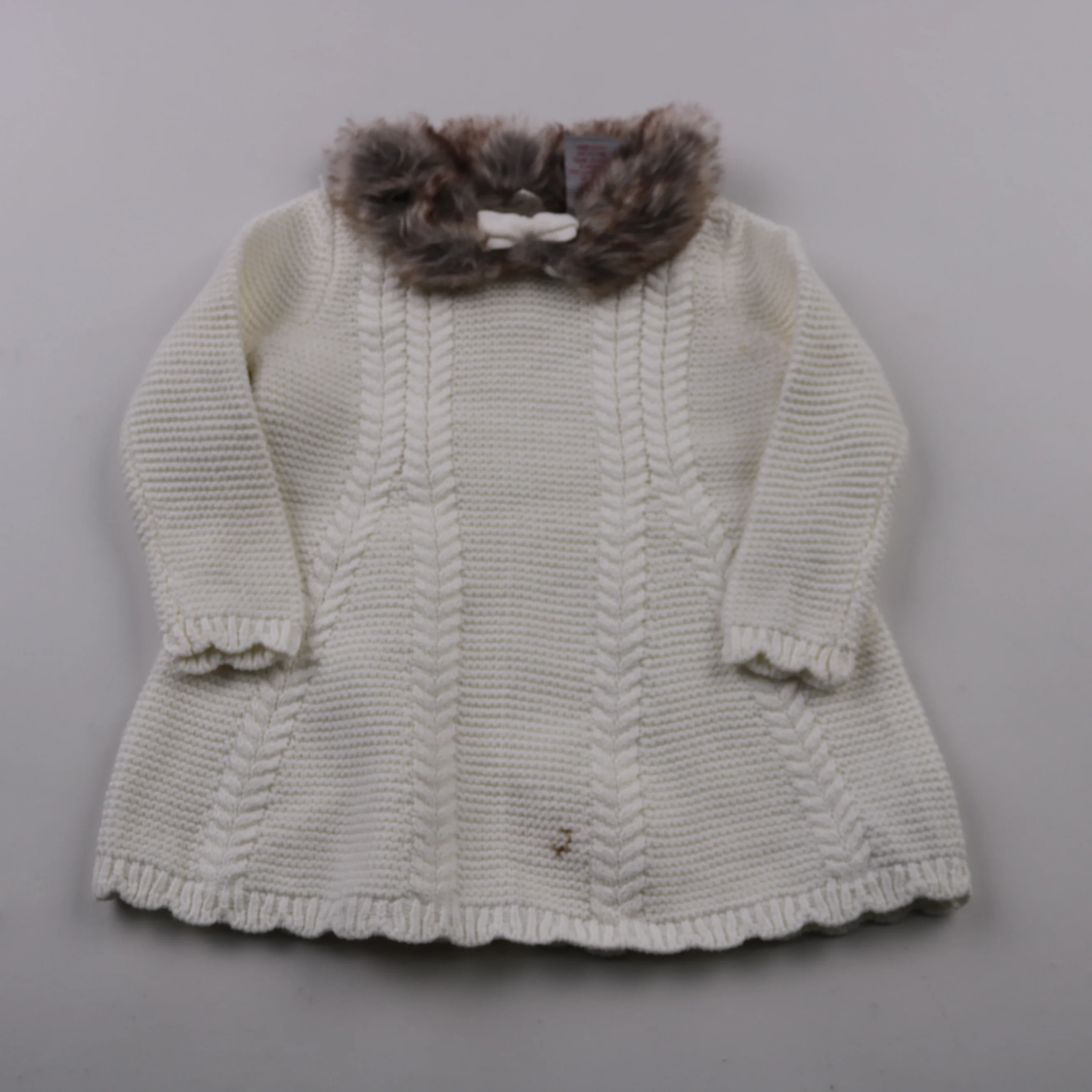 Вязаный свитер Baby молочного цвета с фактурными косами и пушистой отделкой воротника. Подойдёт для прогулок и повседневной носки в прохладную погоду, можно сочетать с легинсами или джинсами. Мягкая пряжа и машинная стирка на деликатном режиме делают у...