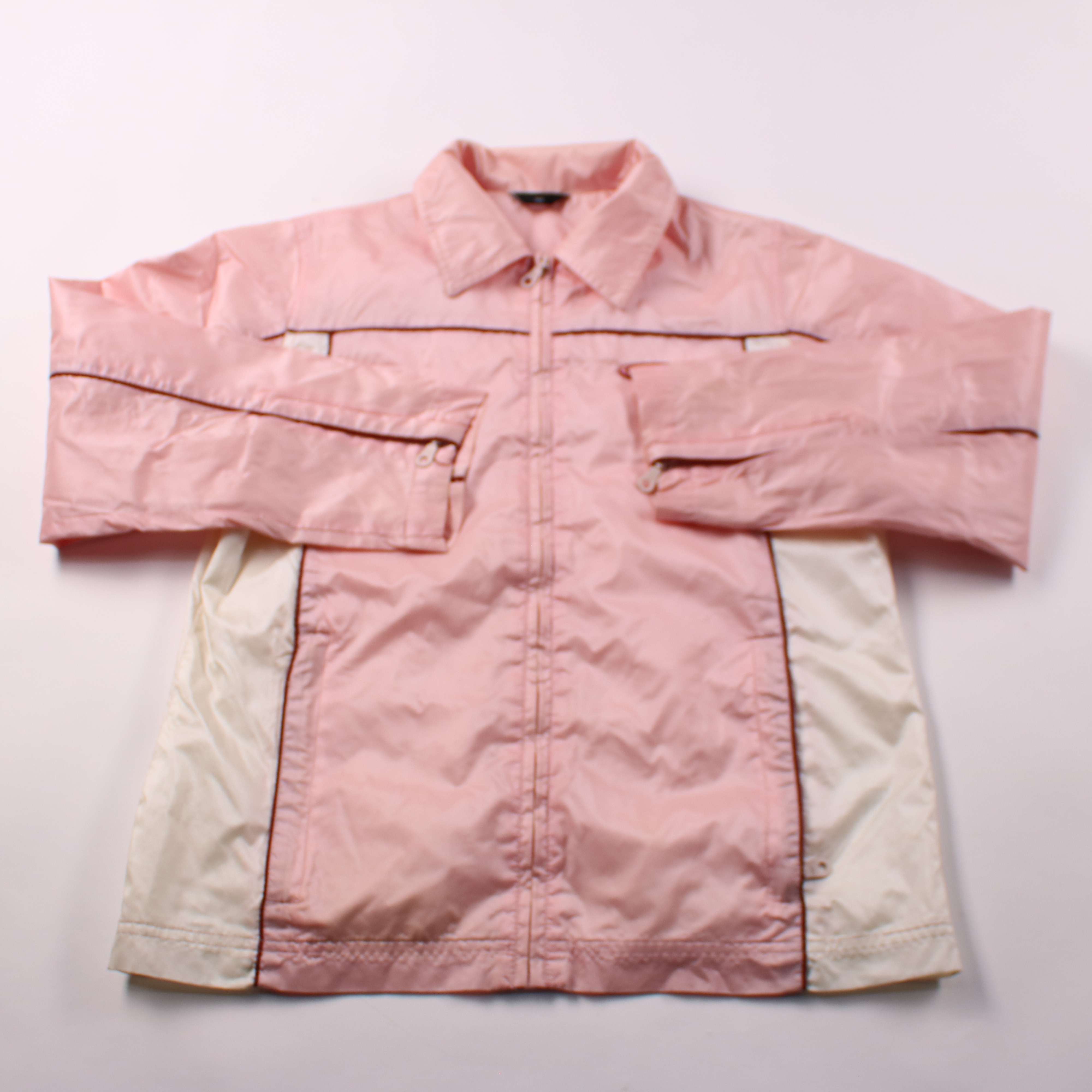 Лёгкая демисезонная куртка в розово-белом цвете с молнией и отложным воротником. Подойдёт для прогулок и школы в прохладную погоду, удобна как верхний слой. Практичный материал нейлон с полиуретановым покрытием помогает защищать от ветра и лёгкой влаги.