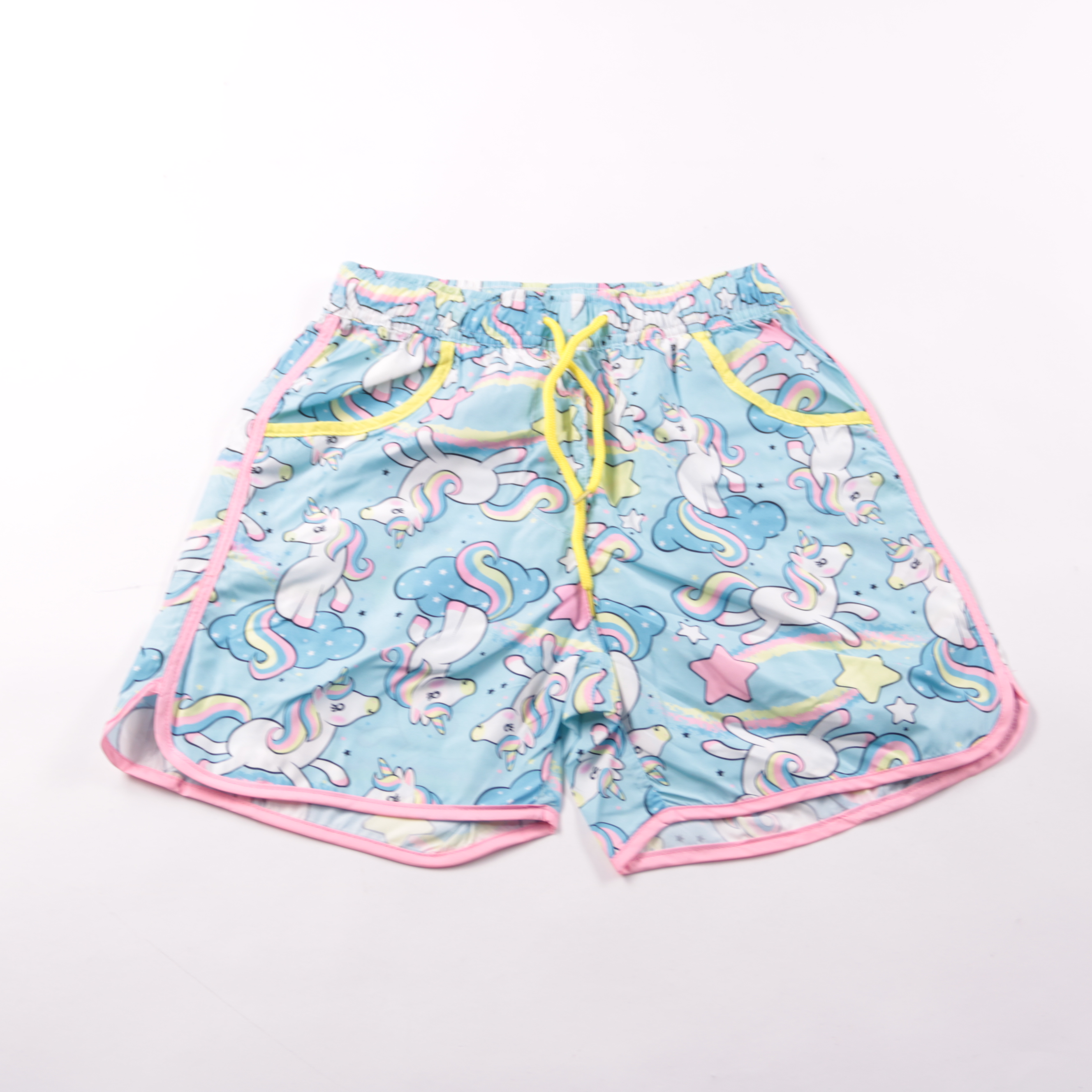 Шорты Zaska! для девочки с ярким принтом единорогов и облаков, на эластичном поясе с шнурком и окантовкой по краю. Подойдут для лета, пляжа и активных прогулок. Лёгкий полиэстер быстро сохнет и не требует сложного ухода.
