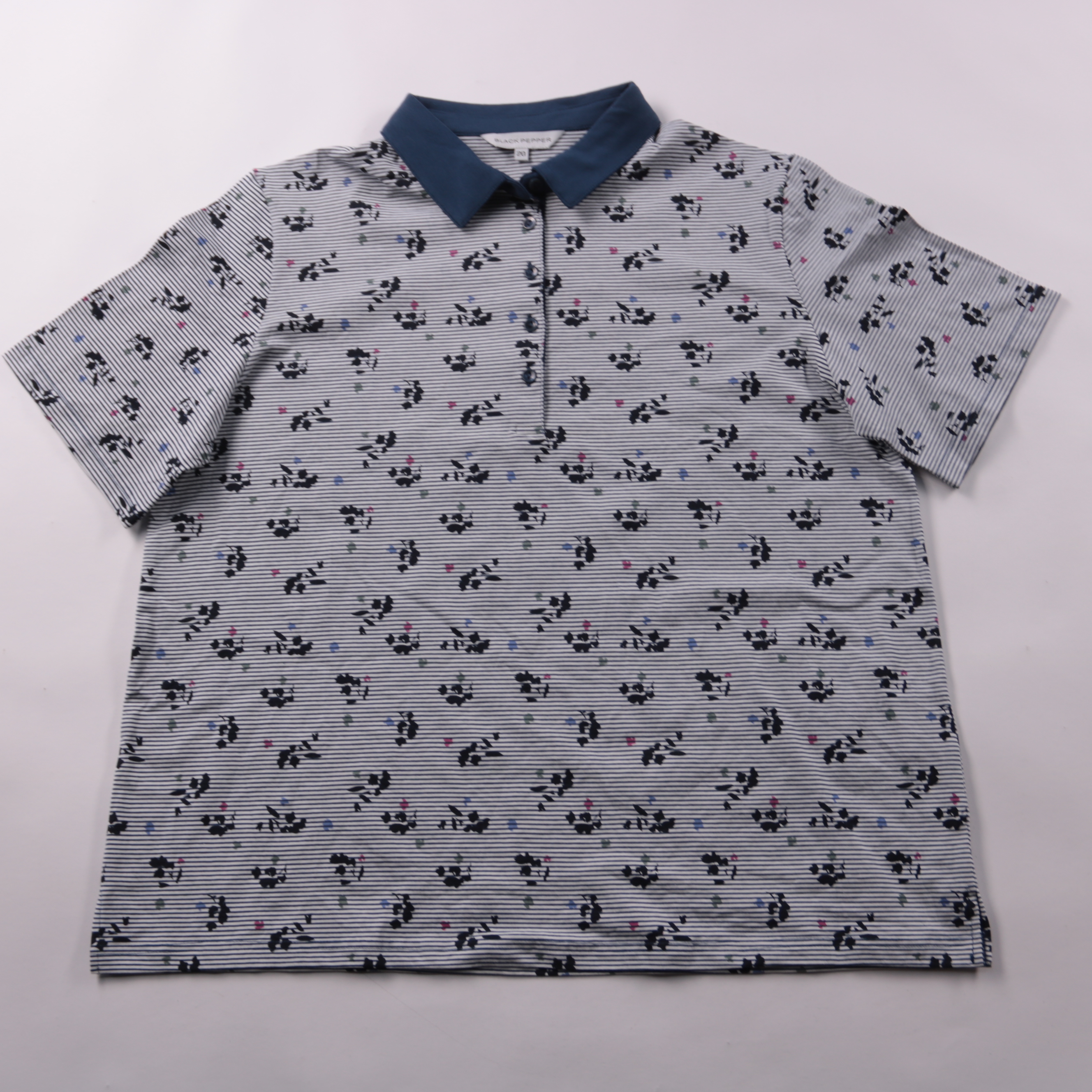 Рубашка-поло Black Pepper в бело-синюю полоску с мелким принтом и контрастным синим воротником. Подойдёт для школы, прогулок и повседневной носки в тёплую погоду. Ткань с добавлением эластана слегка тянется и не сковывает движения.