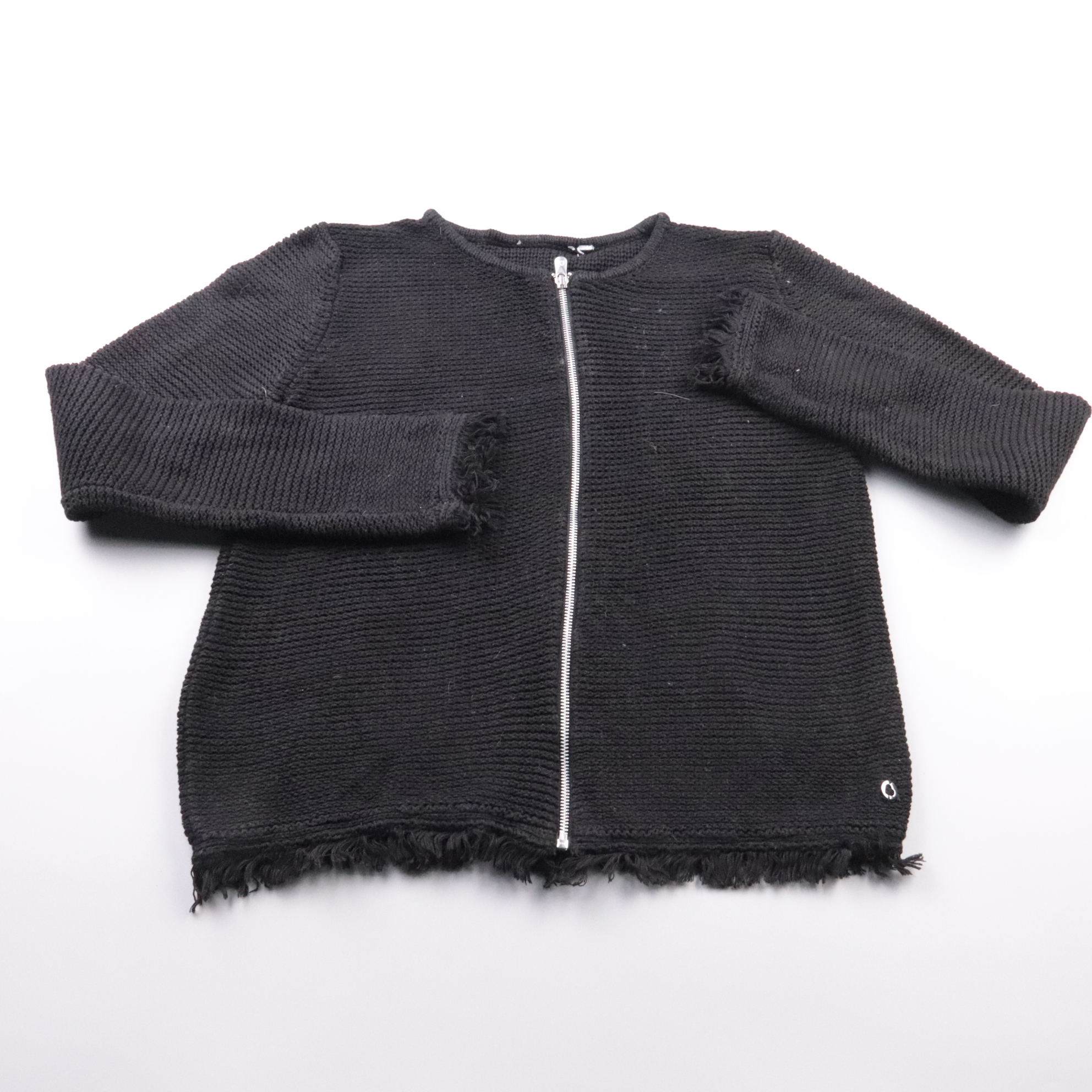 Вязаная кофта на молнии в чёрном цвете, с декоративной бахромой по низу и на манжетах. Подойдёт для школы и прогулок в прохладную погоду, удобно носить как второй слой. Молния по всей длине позволяет быстро надевать и снимать.