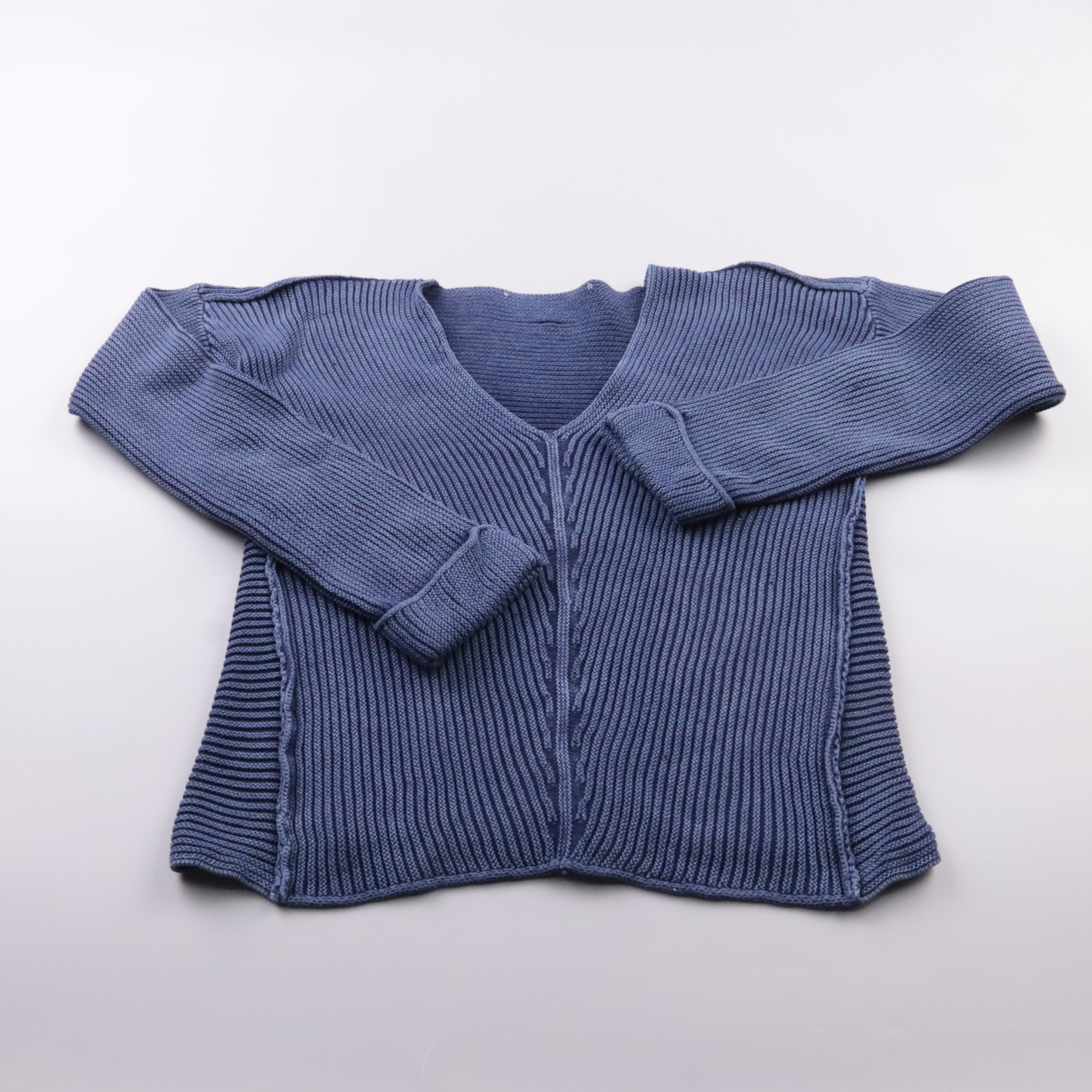 Вязаная кофта на молнии без указания бренда, выполнена в рубчик и в синем цвете. Подойдёт для прогулок и садика в прохладную погоду, удобно носить как второй слой. Молния помогает быстро надевать и снимать, не нарушая причёску.