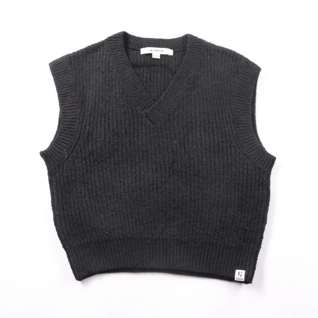 Вязаная жилетка GARCIA чёрного цвета с V-образным вырезом и фактурной вязкой. Подойдёт для школы и повседневной носки поверх рубашки или лонгслива в прохладную погоду. Практична тем, что легко комбинируется и не стесняет движения.