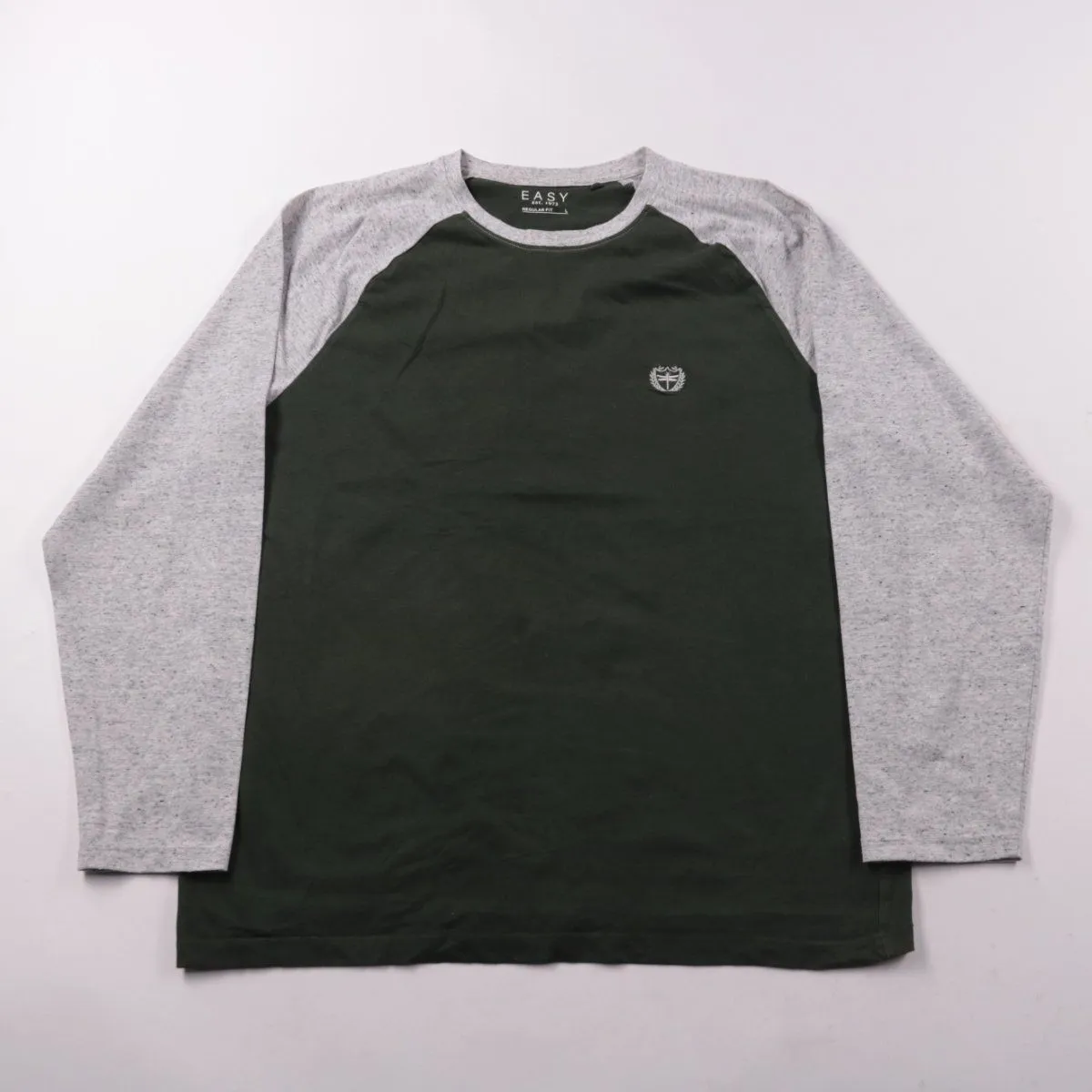 Мужская футболка Easy Regular Fit с длинным рукавом реглан: тёмно-зелёный корпус и серые меланжевые рукава. Подойдёт для повседневной носки и в качестве базового слоя в прохладную погоду. Хлопковый корпус приятно ощущается на теле и хорошо дышит.