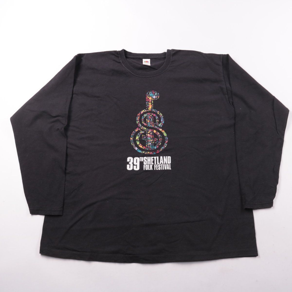 Футболка Fruit of the Loom с длинным рукавом, круглый вырез, цвет чёрный. Спереди принт «39th Shetland Folk Festival» с изображением гитары. Подойдёт для повседневной носки, материал 100% хлопок и приятен к телу.