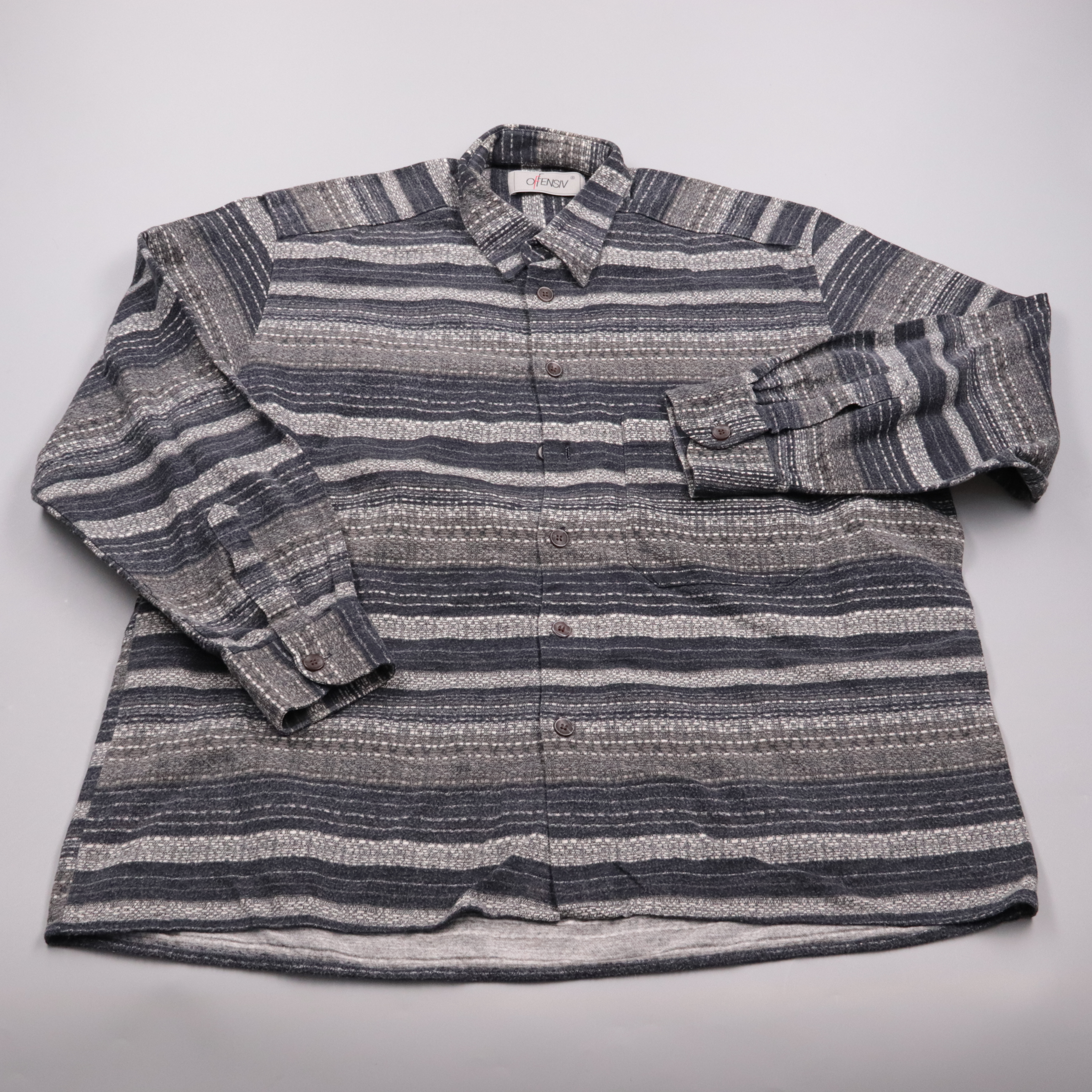 Мужская рубашка Ofensiv из плотной фактурной ткани в серо-чёрную полоску, с длинным рукавом и застёжкой на пуговицы. Подойдёт для повседневной носки в прохладную погоду и в офис в стиле casual. Практичный плюс — материал выглядит аккуратно и хорошо дер...