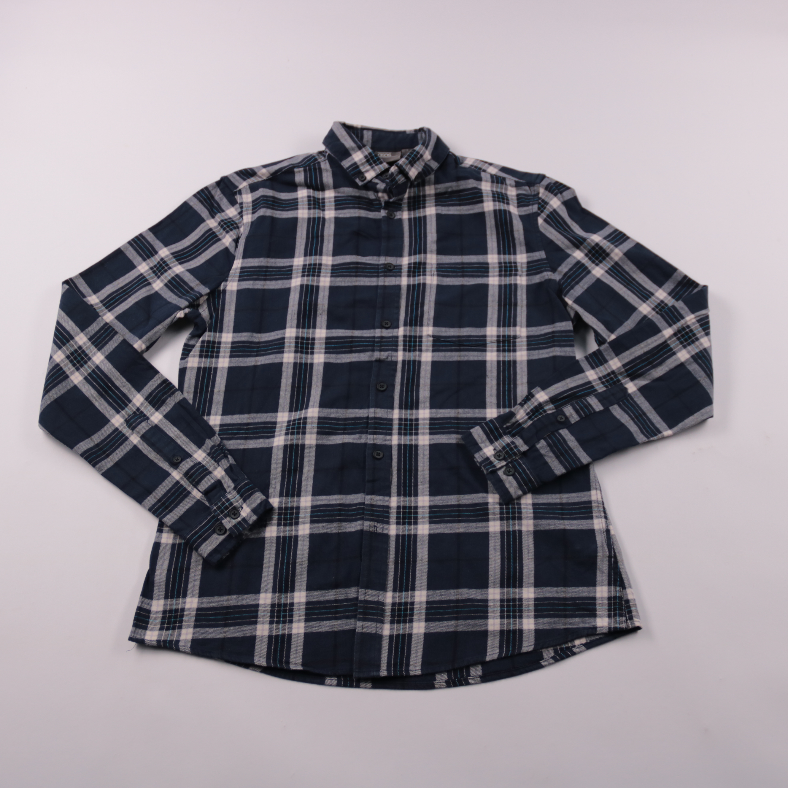 Мужская рубашка ASOS в клетку, тёмно-синего цвета, с длинным рукавом и застёжкой на пуговицы. Подойдёт для повседневных образов и офиса в стиле casual, хорошо смотрится как самостоятельно, так и поверх футболки. Материал с добавлением эластана чуть тян...
