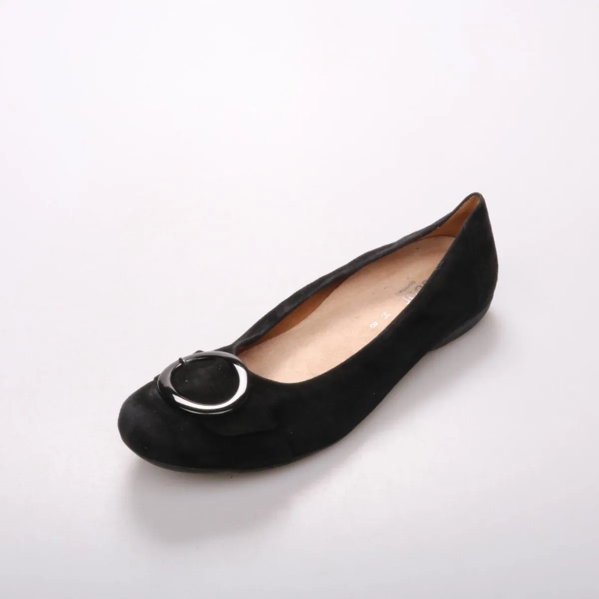 Балетки Gabor из чёрной замши с декоративной круглой пряжкой на носке. Подойдут для повседневных образов и офиса, легко сочетаются с юбками и брюками. Низкий ход и мягкая посадка удобны для длительной ходьбы.