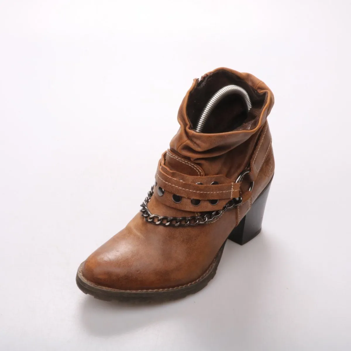 Женские ботильоны Marco Tozzi в коричневом цвете на устойчивом каблуке, с декоративным ремешком и цепочкой. Подойдут для демисезонной погоды и городских образов с джинсами или платьями. Удобно надевать благодаря боковой молнии и практичной рельефной подошве.