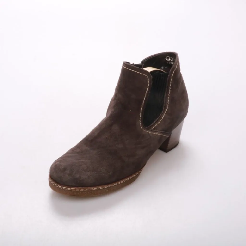 Ботильоны Gabor из коричневой замши на устойчивом каблуке, с боковой молнией. Подойдут для повседневных образов в прохладную погоду и на межсезонье. Практичное преимущество — удобная посадка и нескользящая рифлёная подошва.