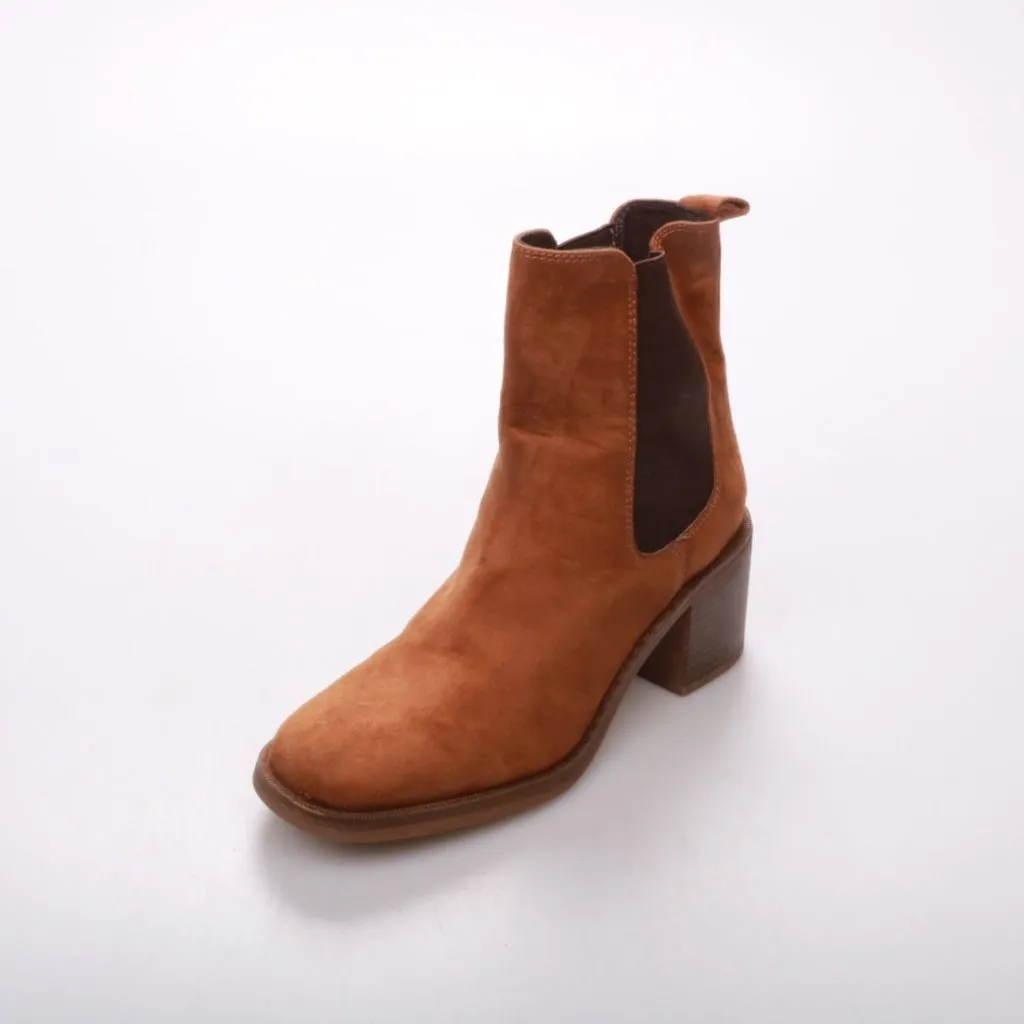 Женские ботильоны в стиле челси из коричневой замши на устойчивом каблуке. Подойдут для повседневных образов в межсезонье и легко сочетаются с джинсами и платьями. Эластичные вставки по бокам позволяют быстро надевать обувь без молнии.