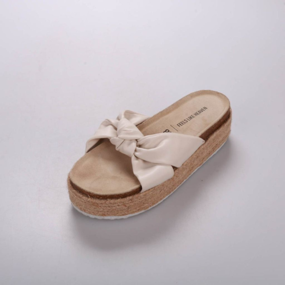 Женские шлёпанцы New Yorker на джутовой платформе с широким перекрученным ремешком. Подойдут для летних прогулок, отпуска и повседневных образов с платьями или шортами. Удобная кожаная стелька и нескользящая подошва для комфортной носки.