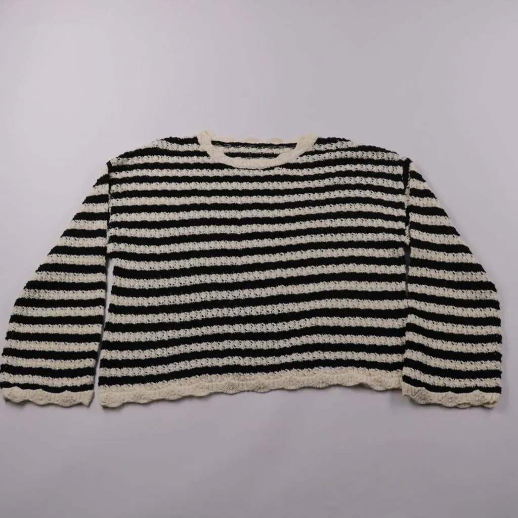 Вязаный джемпер в чёрно-белую полоску с круглым вырезом и длинными рукавами. Подойдёт для повседневных образов в прохладную погоду, хорошо сочетается с джинсами и однотонными юбками. Практичное преимущество — плотная фактурная вязка хорошо держит форму.