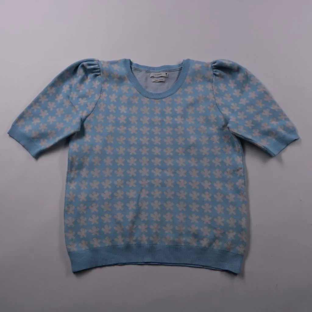 Женский джемпер Reserved голубого цвета с светлым цветочным принтом и рукавами 3/4 с небольшими сборками на плечах. Подойдёт для повседневных образов и офиса в демисезон, можно носить как самостоятельный верх или под жакет. Практичное преимущество — мя...