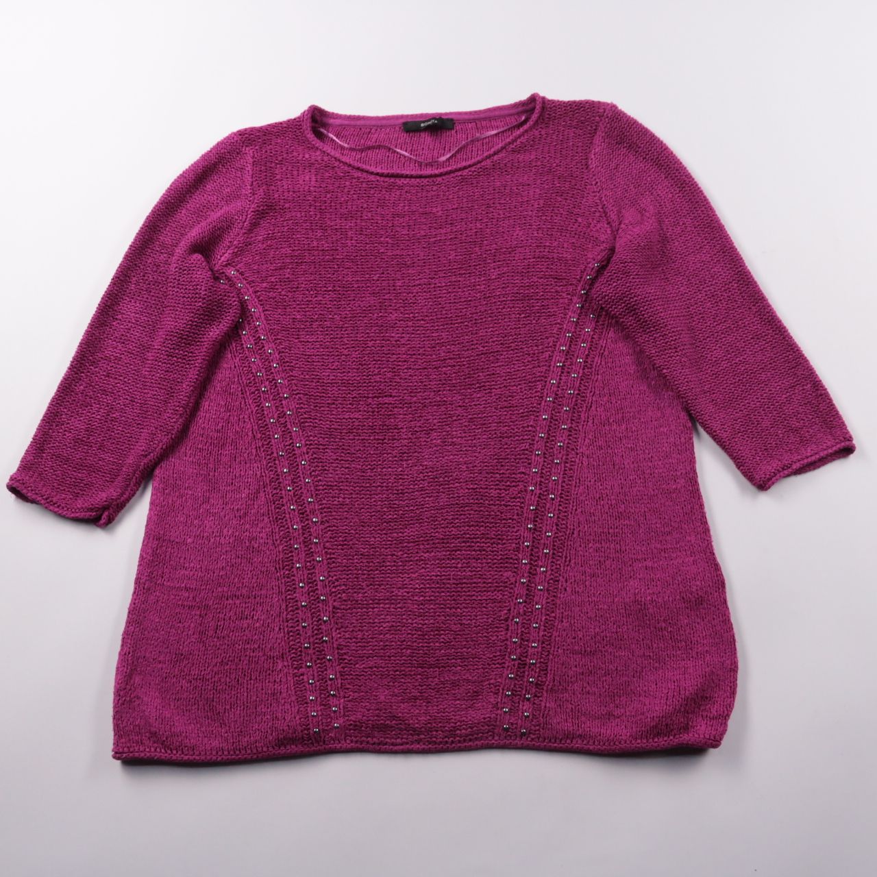 Женский вязаный джемпер Bonita в цвете фуксия с круглым вырезом и рукавом 3/4. Спереди есть декоративные вертикальные вставки с мелкими заклёпками, которые визуально вытягивают силуэт. Подойдёт для повседневных образов в прохладную погоду, материал мяг...