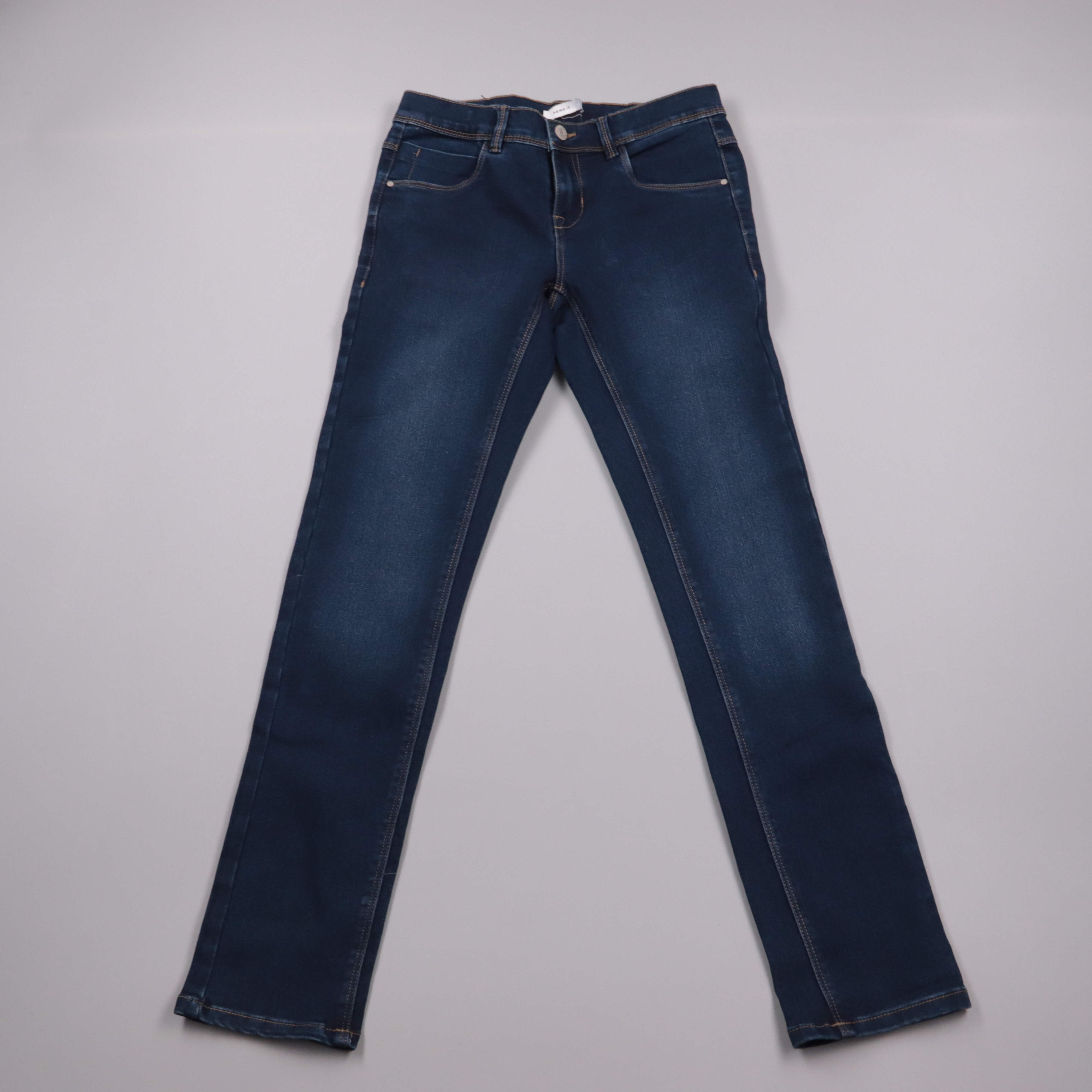 Джинсы Name It из тёмно-синего денима с лёгким высветлением и классической посадкой на молнии. Подойдут для повседневных образов с кедами, ботинками или балетками. Ткань со стрейчем, поэтому удобно сидят и не сковывают движения.