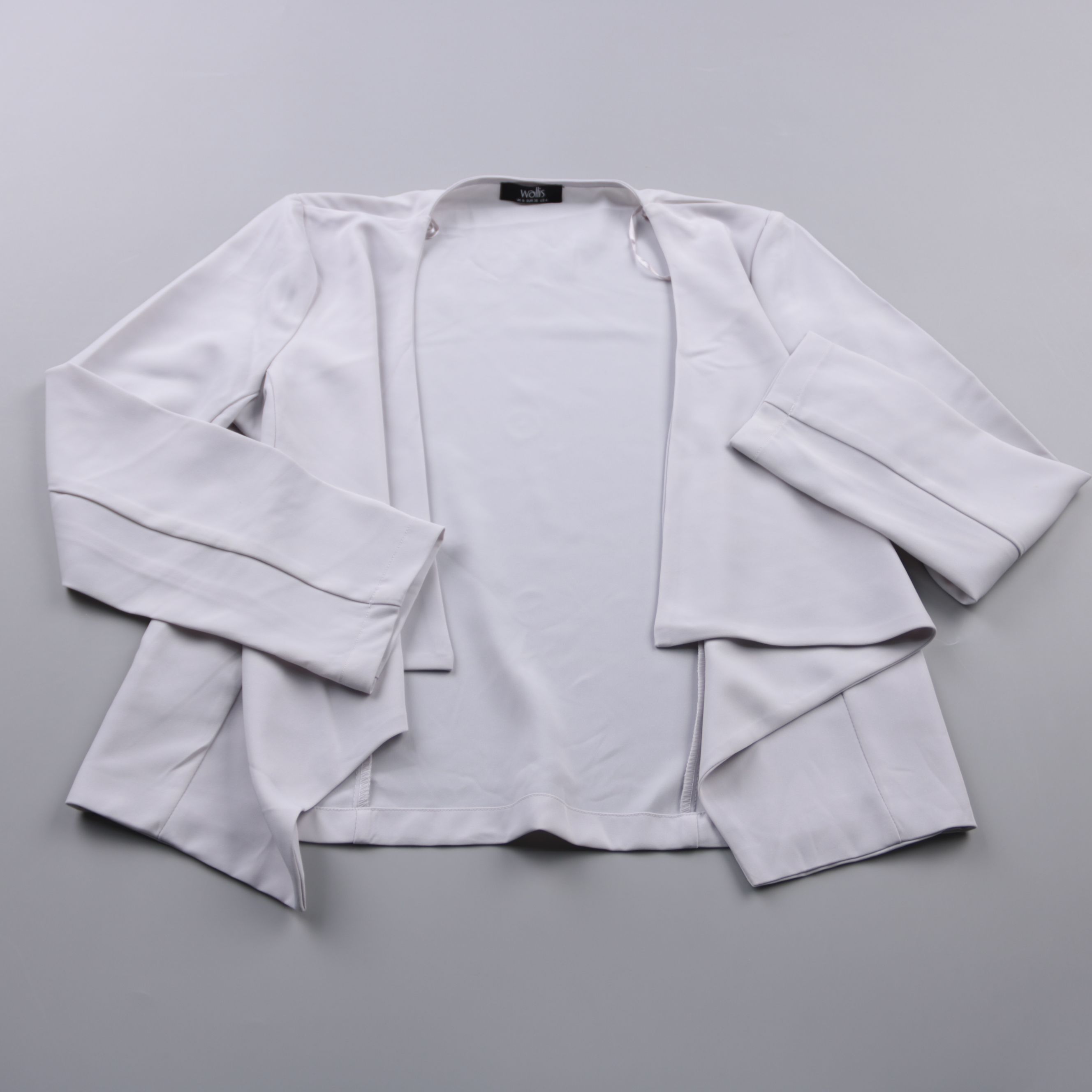 Женский жакет Wallis светло-серого цвета, укороченный, с открытым передом и длинными рукавами. Подойдёт для офиса и повседневных образов в прохладную погоду, легко сочетается с платьями и брюками. Эластичная ткань (полиэстер с эластаном) комфортно сади...
