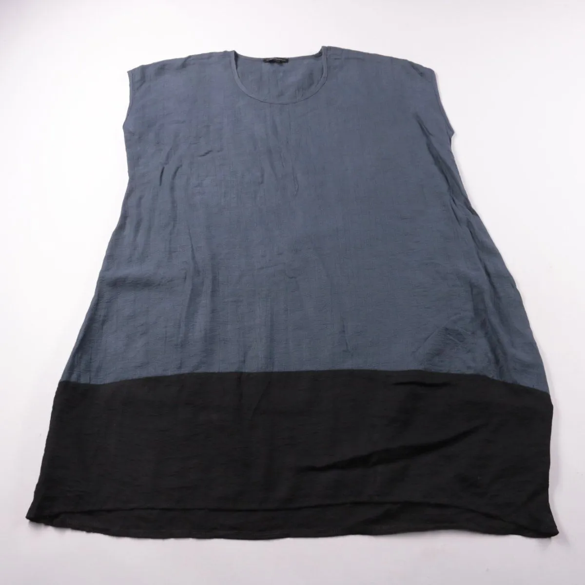 Женский топ Vigorella свободного кроя с короткими цельнокроеными рукавами и круглым вырезом. Двухцветный дизайн: сине-серый верх и чёрная широкая вставка по низу — подойдёт для повседневной носки в тёплую погоду. Ткань с бамбуком хорошо дышит и приятна к телу.