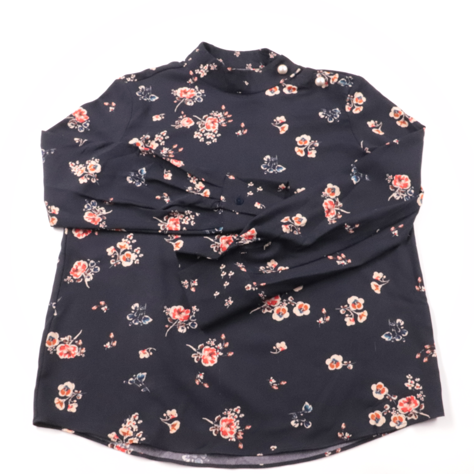 Женская блузка Zara Basic тёмно-синего цвета с мелким цветочным принтом и воротником-стойкой на декоративных пуговицах. Подойдёт для офиса и на каждый день, хорошо сочетается с брюками или юбкой. Практичная синтетическая ткань почти не мнётся и проста ...