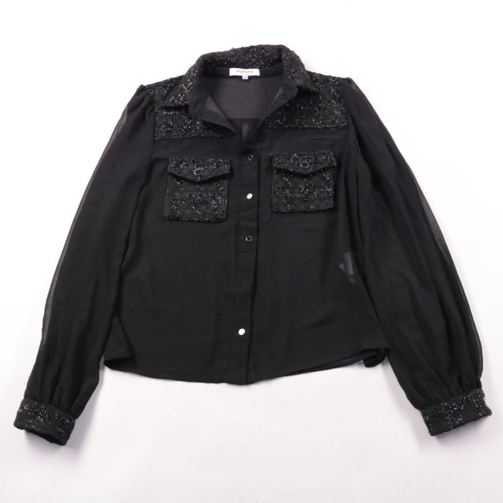 Блузка Morgan чёрного цвета с застёжкой на пуговицы и нагрудными карманами. Акцент — отделка из твида с лёгким блеском на кокетке и манжетах и полупрозрачные рукава, подойдёт для офиса и вечерних выходов. Практичный материал легко стирается и быстро со...