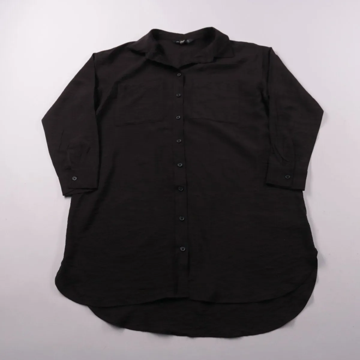 Чёрная блузка F&F на пуговицах с отложным воротником и удлинённой спинкой. Подойдёт для офиса и повседневных образов, легко сочетается с брюками и джинсами. Практичный плюс — универсальный цвет и длинный рукав для прохладной погоды.