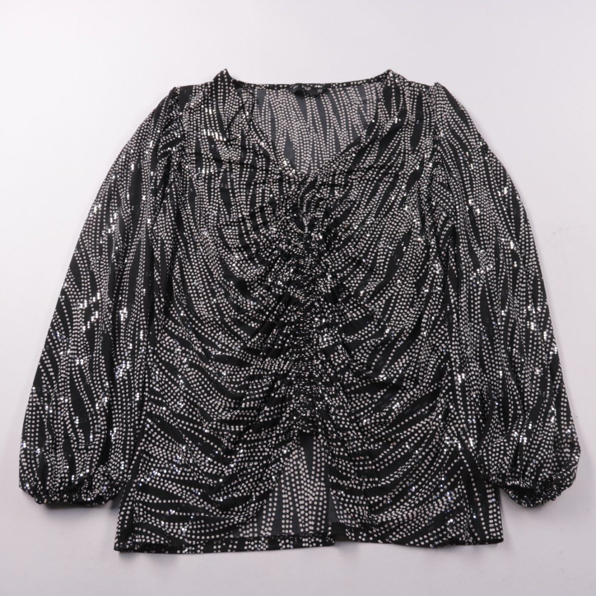 Блузка F&F чёрного цвета с белым принтом, с V-образным вырезом и драпировкой по центру. Подойдёт для повседневных образов и для офиса, хорошо сочетается с брюками и юбками. Практичный материал из полиэстера легко стирается и быстро сохнет.