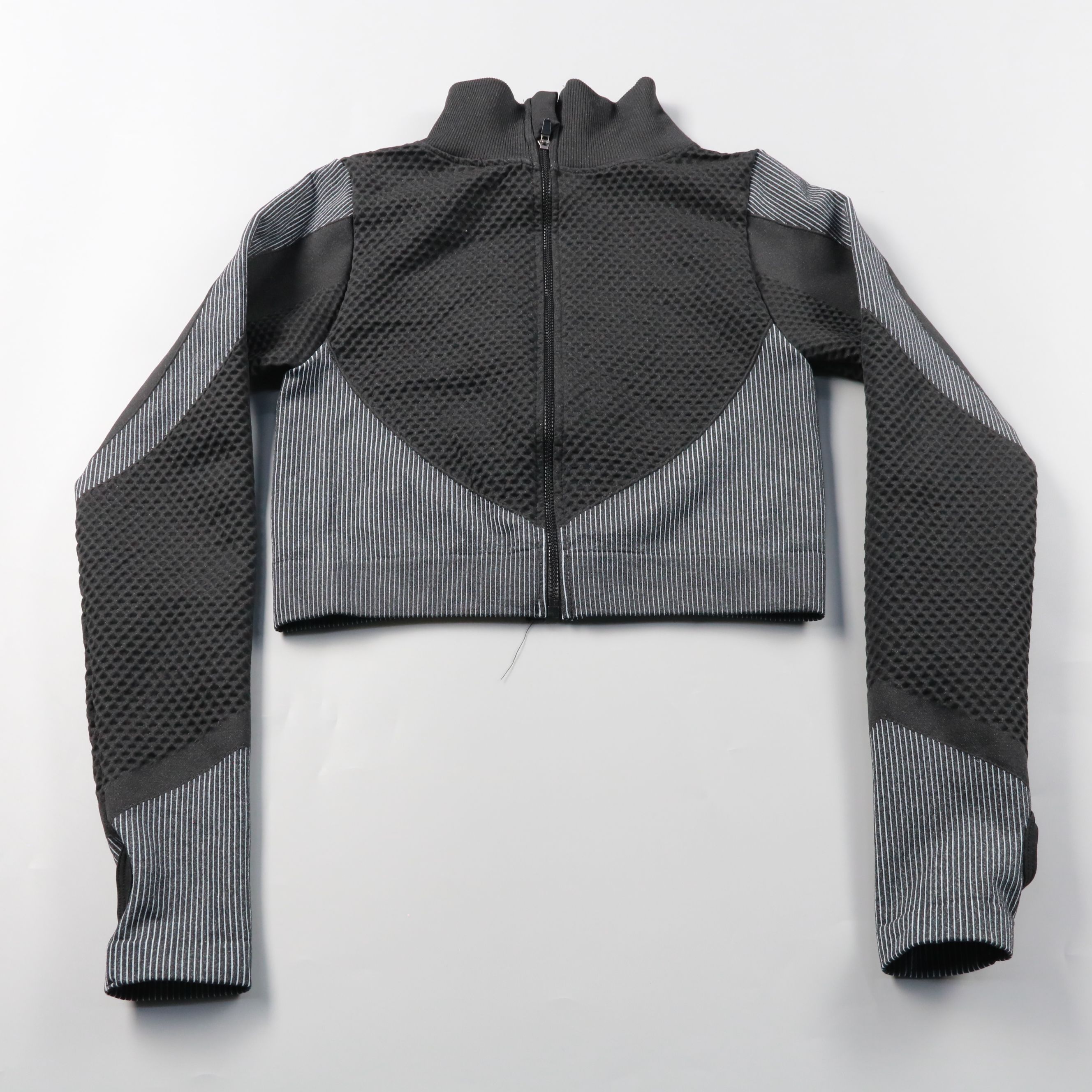 Укороченная кофта на молнии с высоким воротником, выполнена в чёрно-сером цвете с фактурными вставками. Подойдёт для тренировок и повседневных образов в спортивном стиле. Застёжка-молния позволяет удобно регулировать посадку и вентиляцию.