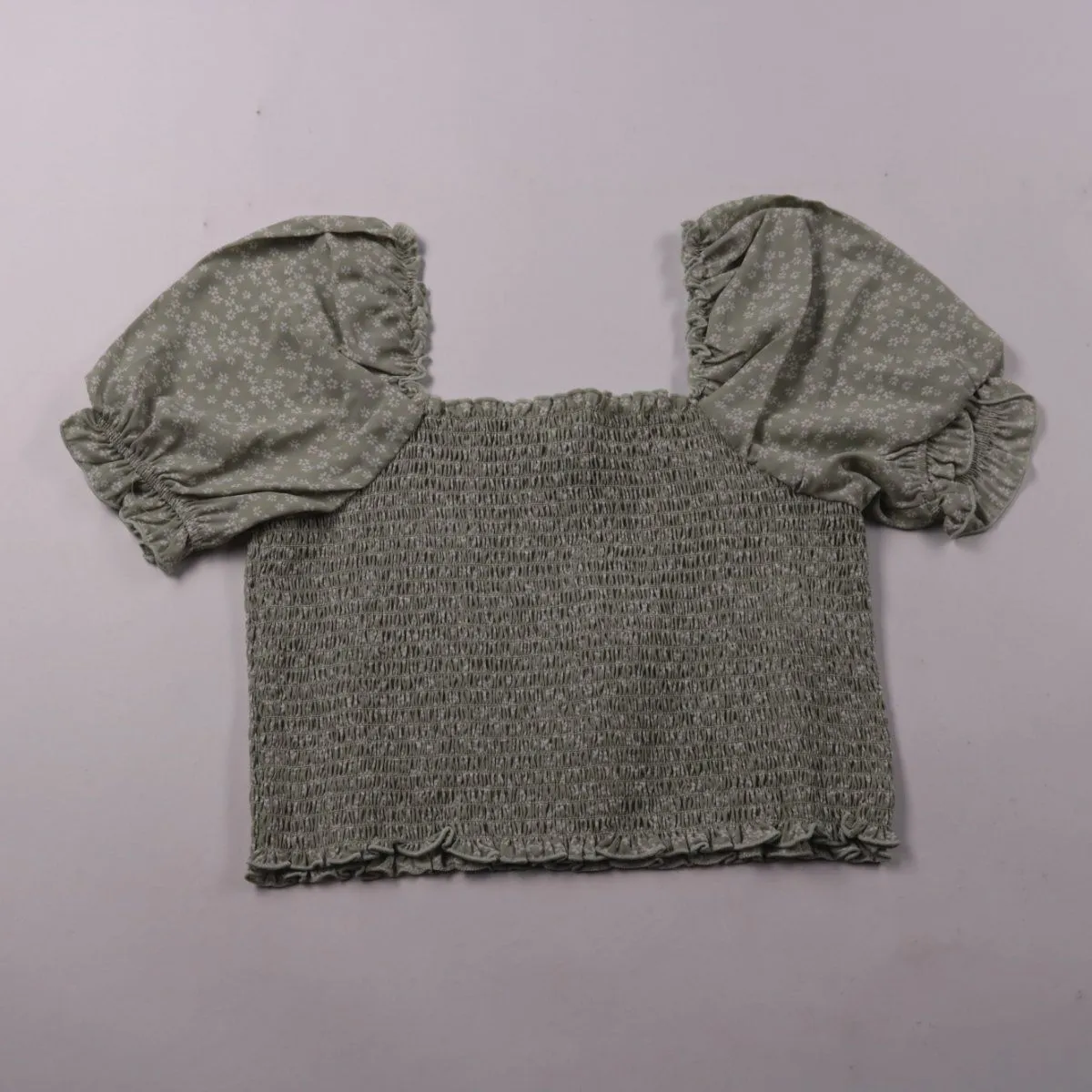 Укороченный топ NA-KD с эластичной смокинг-резинкой по корпусу и пышными рукавами с рюшами, принт — мелкие белые цветочки на пыльно-зелёном фоне. Подойдёт для летних образов с джинсами, шортами или юбкой и хорошо сидит за счёт тянущейся посадки. Практичный плюс — не требует застёжек и комфортно подстраивается по фигуре.