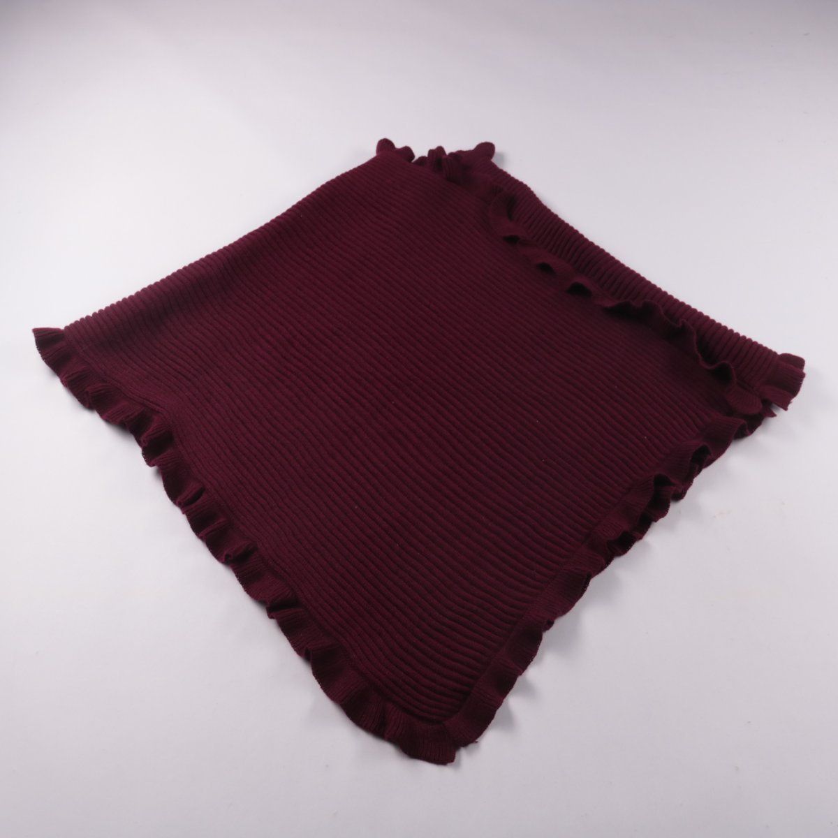 Вязаное пончо бордового цвета с рельефной фактурой и волнистой окантовкой по краю. Подойдёт для прогулок и как накидка поверх базовых вещей в прохладную погоду. Мягкий трикотаж удобно драпируется и не стесняет движений.