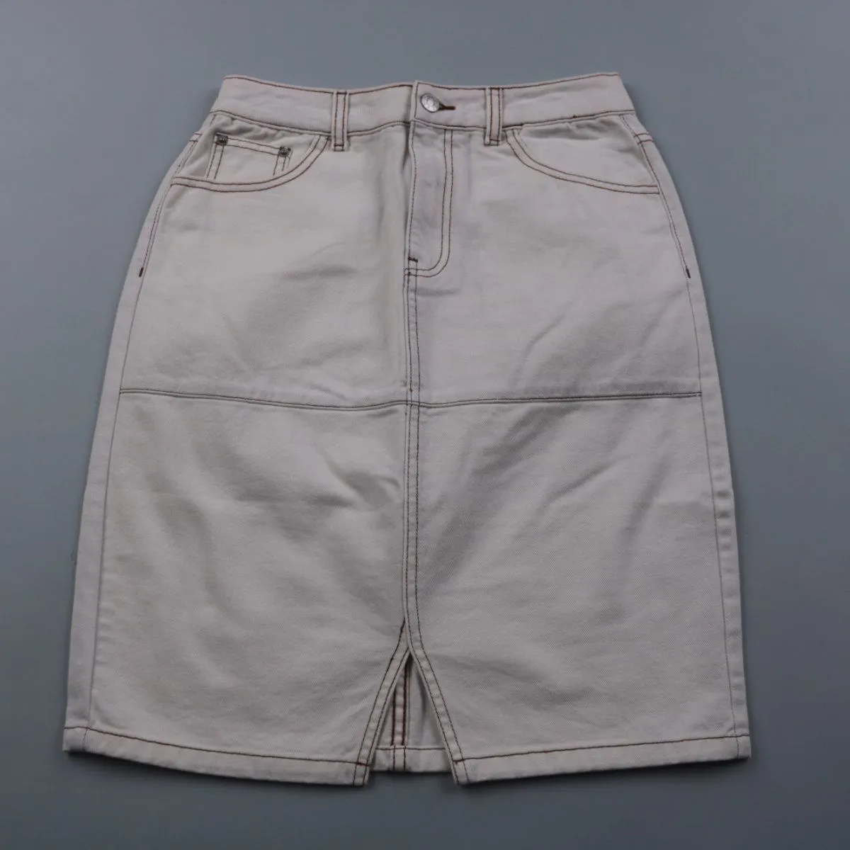 Юбка NA-KD молочного оттенка из плотного хлопка, с карманами и контрастной отстрочкой. Спереди есть разрез, поэтому в ней удобно ходить в повседневных образах. Материал держит форму и хорошо носится.