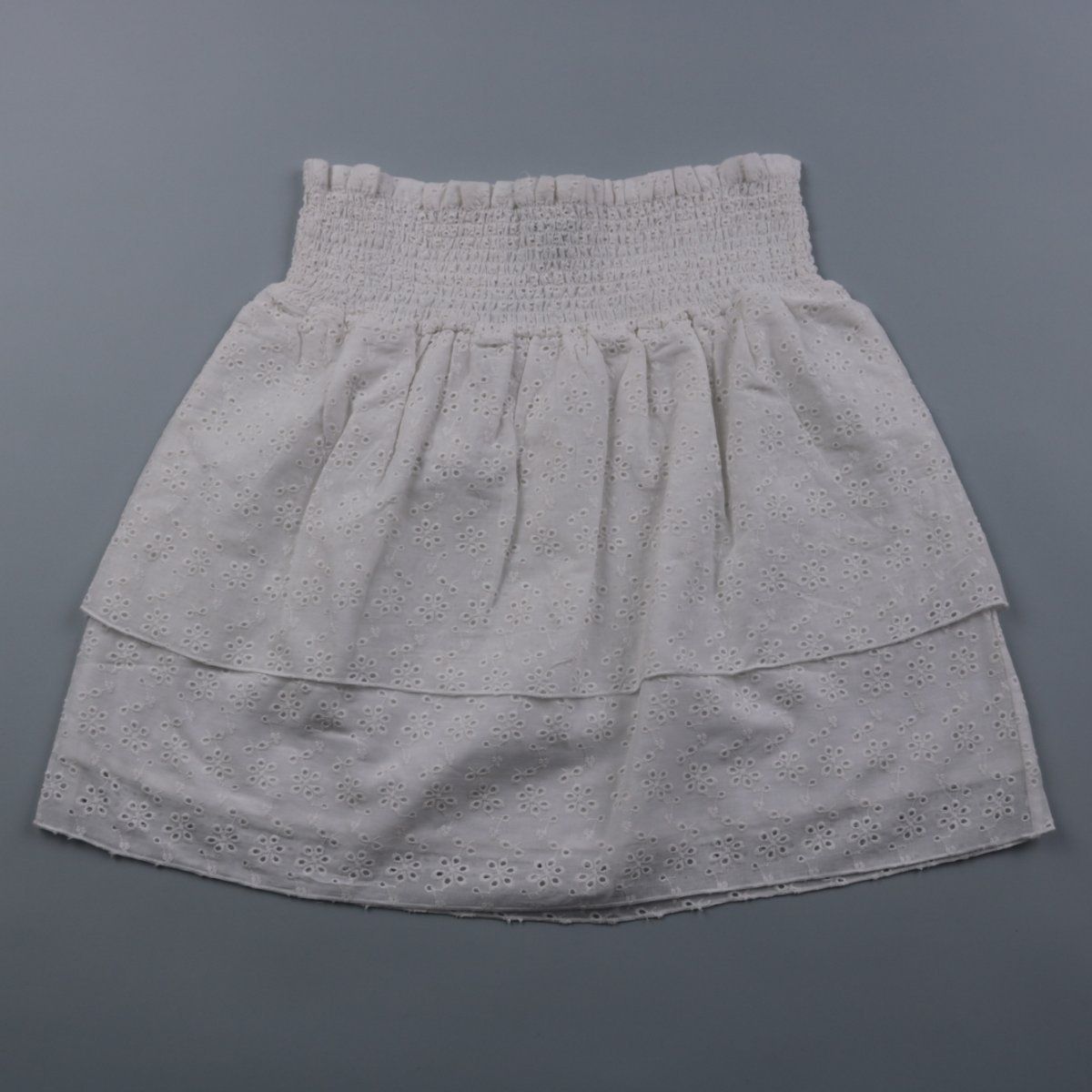 Белая юбка NA-KD с вышивкой ришелье и ярусным кроем. Сверху широкая эластичная кокетка-смок, удобно садится по талии. Подойдёт для летних повседневных образов и отдыха, практичный плюс — комфортная посадка без молнии.